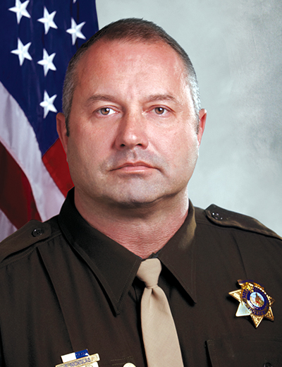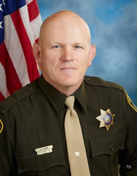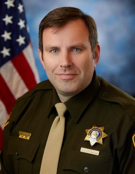 Gold seven-point star badge with black banner reading L.E.A.F., featuring a Thin Blue Line American flag and text Law Enforcement Assistance Fund, Las Vegas Clark County, Nevada.